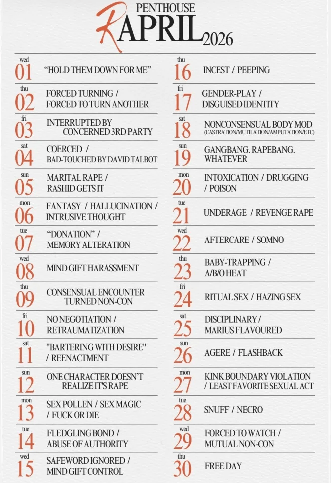 THE PENTHOUSE IRC is back at it again with a new collection/writing challenge, wherein every day in April there's a new rape/non-con themed prompt. I'm posting daily drabbles here and on AO3, with longer fics posting irregularly throughout the month, my capacity to keep up with them permitting! Check out my maggots, and the rest of the collection! The server is currently closed to new members, but we always welcome new friends joining us in our events, so check out the prompts if you're interested.