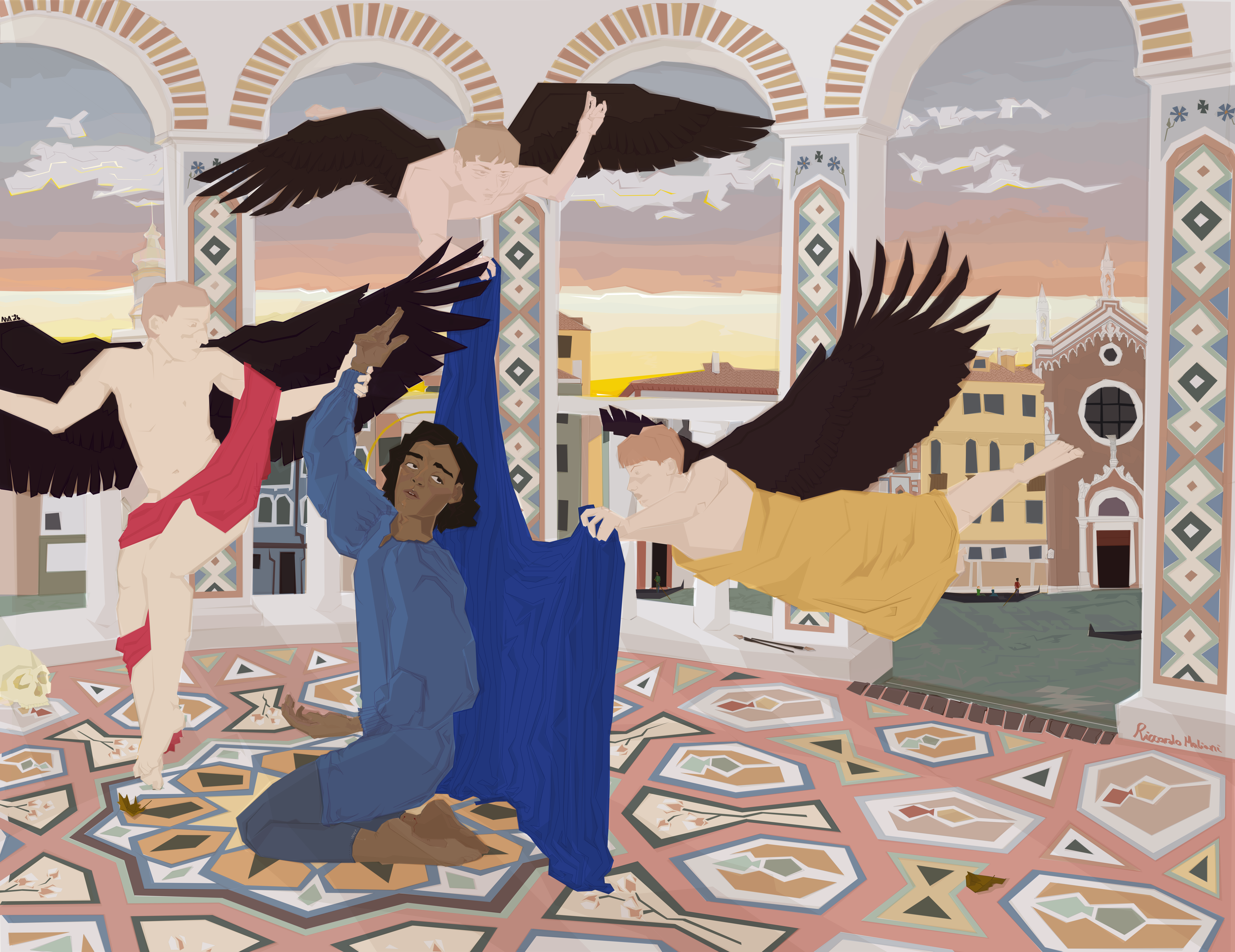 Signed by none other than Riccardo Maliani, who was a student of de Romanus in his youth, and ultimately significantly more successful than his former master, the painting depicts the titular Amadeo (a slave and favourite model of many Venetian masters) surrounded by eclectic religious imagery, including a trio of uncanny, black-winged angels. See the painting in full here or on AO3.
